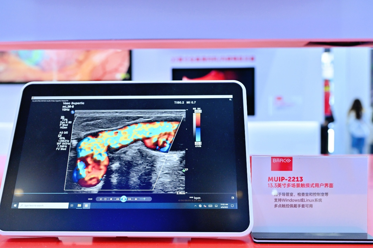 在CMEF上同期亮相的巴可13.3 寸全高清医用平板,搭载 Win10 系统,可用于为医疗系统提供用户界面的第三方软件应用程序。其清晰的图像质量和宽视角,经过DICOM灰度校正,在复杂条件下依然保持精准的影像还原。采用P-CAP Multi-Touch 技术,戴着手术手套和手术布也能精准操作,适配无菌环境。此外,还集成USB,以太网,USB-C等端口,能够在桌面、推车、手臂或吊杆上灵活安装,为医生治疗提供了更加便捷、高效的操作体验。