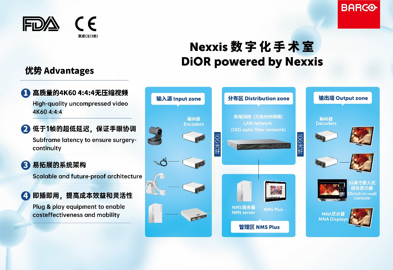 巴可24英寸手术室嵌入式工作站 MDMX-22400和55寸手术室嵌入式工作站MDMX-25500在展会上的亮相,成为焦点。两款工作站均集成了 Nexxis 解码器,具有强大的术中影像集成管理和控制功能,支持多屏协同工作模式,满足不同场景对屏幕尺寸的差异化需求,又能为手术团队提供更宽广、更清晰的视野。其中,前者采用全高清触控显示屏,支持整个手术室工作人员组合和查看多个图像,轻松便捷;后者屏更大,分辨率更高,可通过WorkSpot 功能实现六分屏,与更能与远程 PC 视频源交互,为复杂手术提供跨地域的会诊支持。